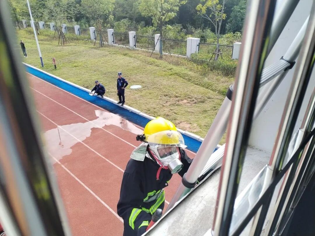 项目3:着装灭火操。考验的是应急反应的“黄金速度”,随着哨声响起,队员们如离弦之箭般冲向装备区,消防服、消防靴、头盔、空气呼吸器在他们手中快速翻飞。套裤腿、系腰带、戴头盔、扣面罩,仅用数十秒便完成全套着装,随后手持灭火器直奔模拟火场。拔销、提瓶、瞄准火源根部、按压喷射,白色干粉精准覆盖起火点,整套流程一气呵成,每一个动作都凝聚着日常训练的汗水,彰显着“秒级响应”的实战能力。