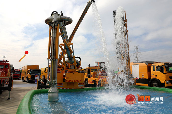 由龙岩市本地企业福建侨龙研制的“龙吸水”1500后双桥高空式供排水抢险车是针对国内市政排水及消防配套供水而专门研制的一款应急抢险救灾设备。图为8日该设备在机博投洽会现场进行操作演示。